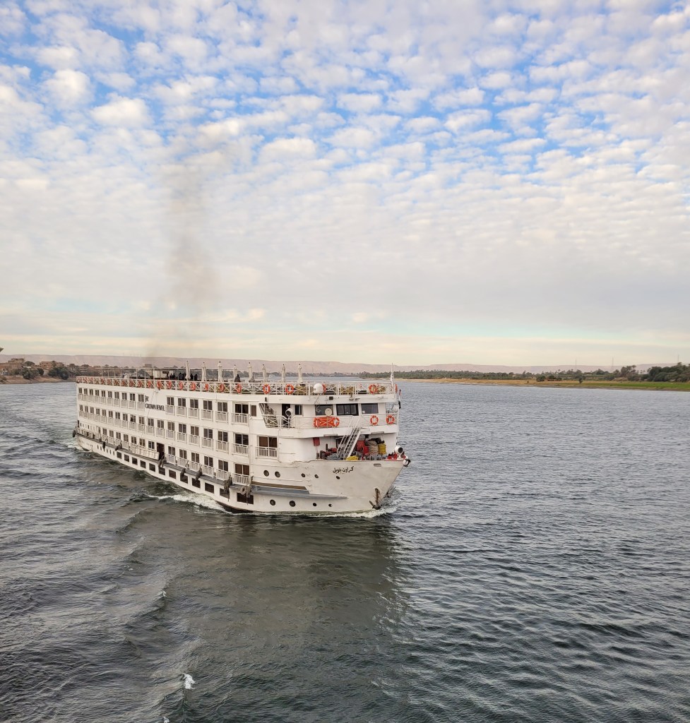 We’re cruising up the Nile on a boat similar to the one in this photo except our boat is better because we caught and passed it. Take that white boat.