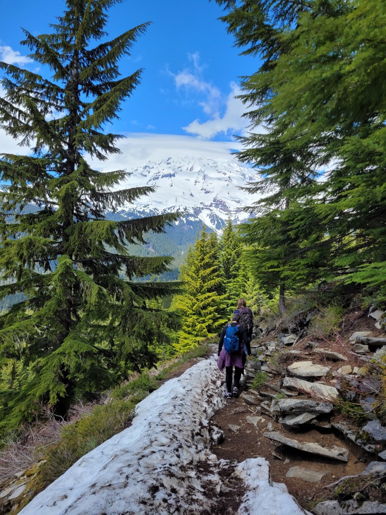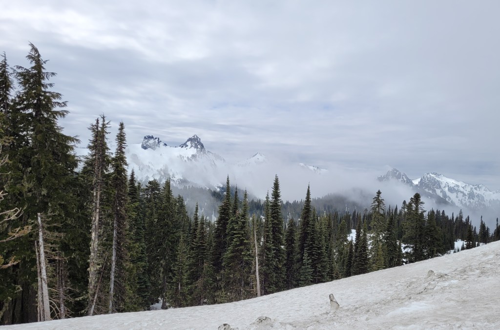 I had intended to hike but couldn’t make much progress in just hiking shoes. The top of Mt Rainier was buried in clouds and snow. Beautiful though.