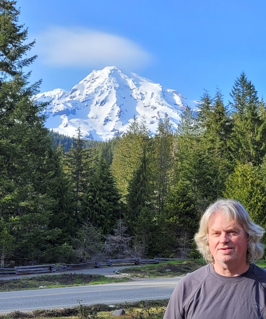 Mt Rainier is finally clear of clouds late this afternoon. Wow. What a sight. A beautiful 14,417 ft volcano. I think it’s our Mt Fuji.
