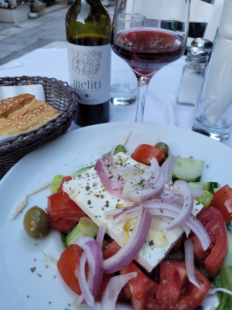 Just had a Greek salad with bread and Greek wine. Watch out for menu items with “Greek” in the name. They may be overpriced just for us tourists.