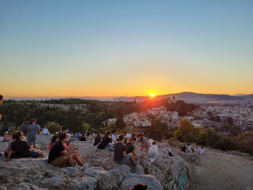 Made it to Areopagus Hill near the Acropolis to watch the sunset. Hundreds of people did the same. The hill is composed mostly of limestone but the rock I sat on was as polished as marble because so many people have sat on it over the years.