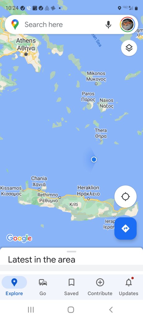 The screenshot of the map shows where the ferry was when I captured the image. Santorini is labeled Thera because that’s its other name.