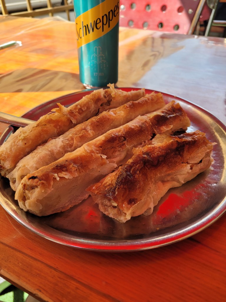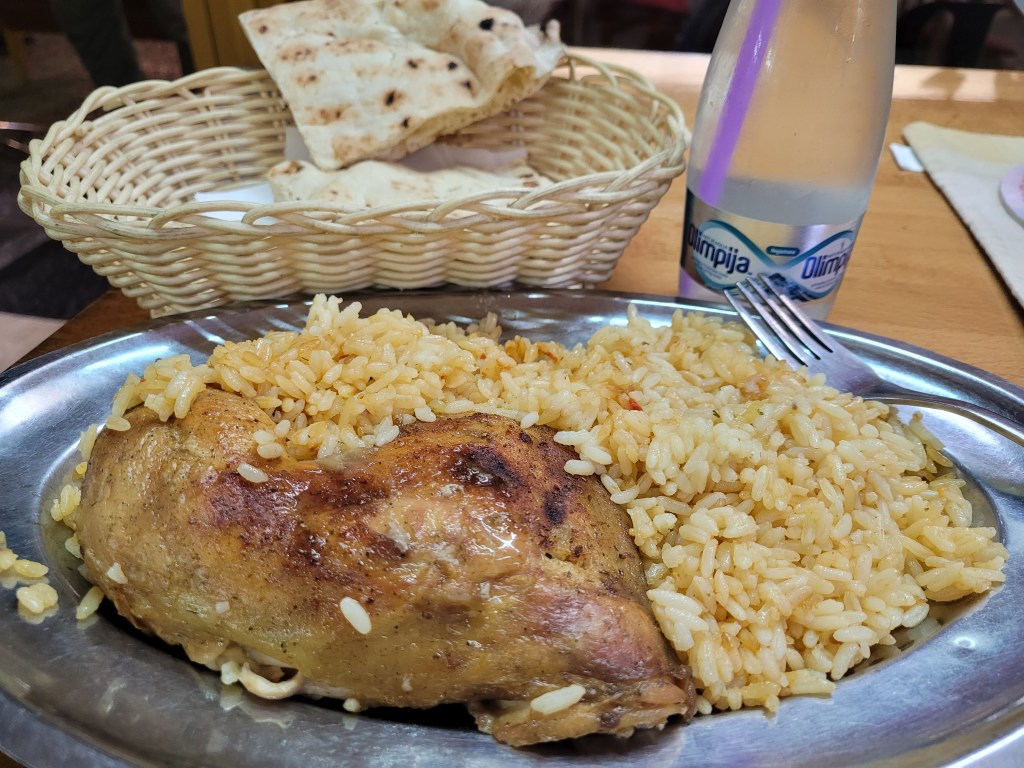 And, had roasted chicken, rice with sweet paprika, and flat bread that the owner/cook called somun. It’s a yeast raised flat bread common in the Balkans. Meal cost $6.