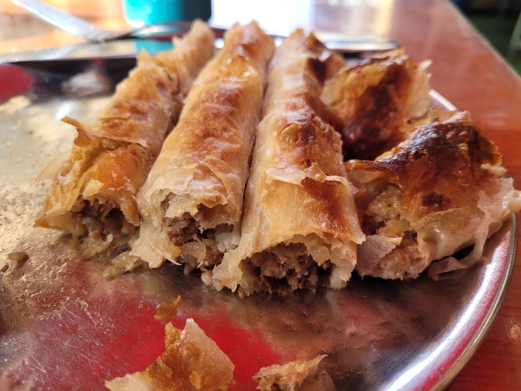 There are fillings like ground meat or spinach and cheese both of which I tried. It’s good stuff.