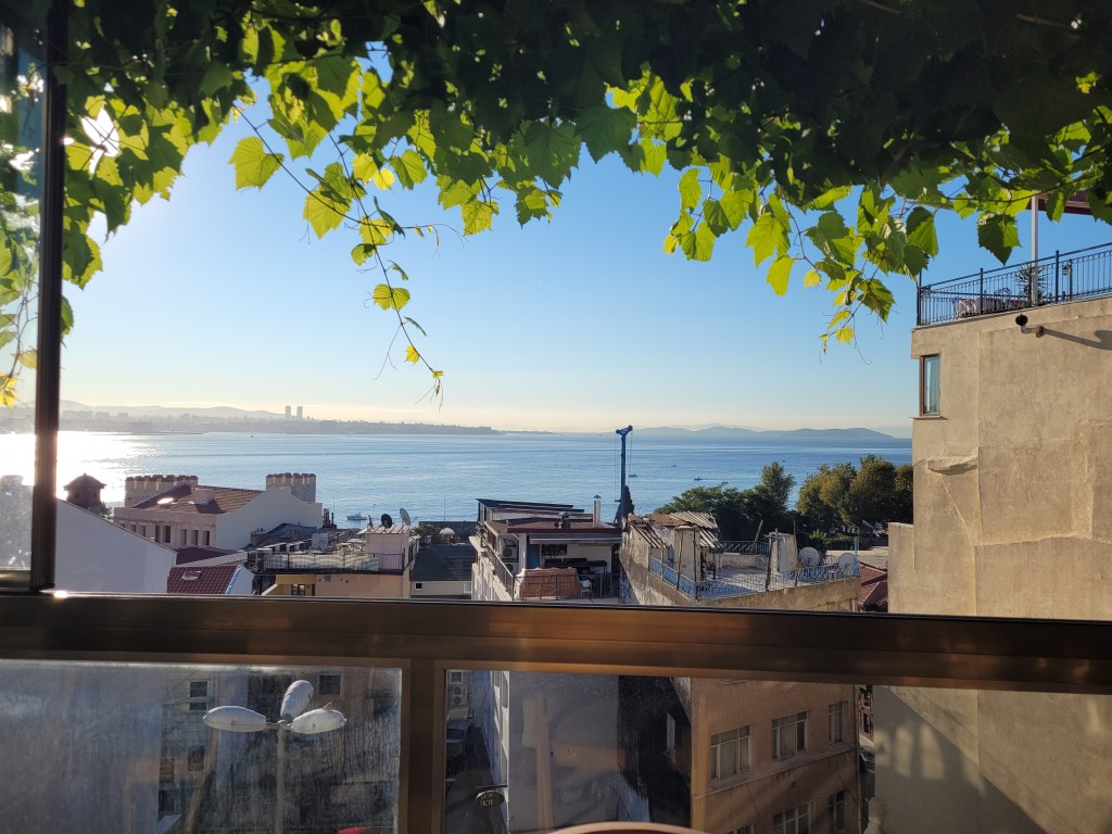 Breakfast at the Marmara Guesthouse with a good view from the terrace of the south end of the Bosphorus Strait in Istanbul. Across the water is part of Istanbul in Asia.
