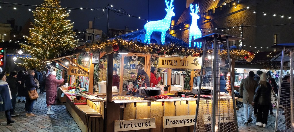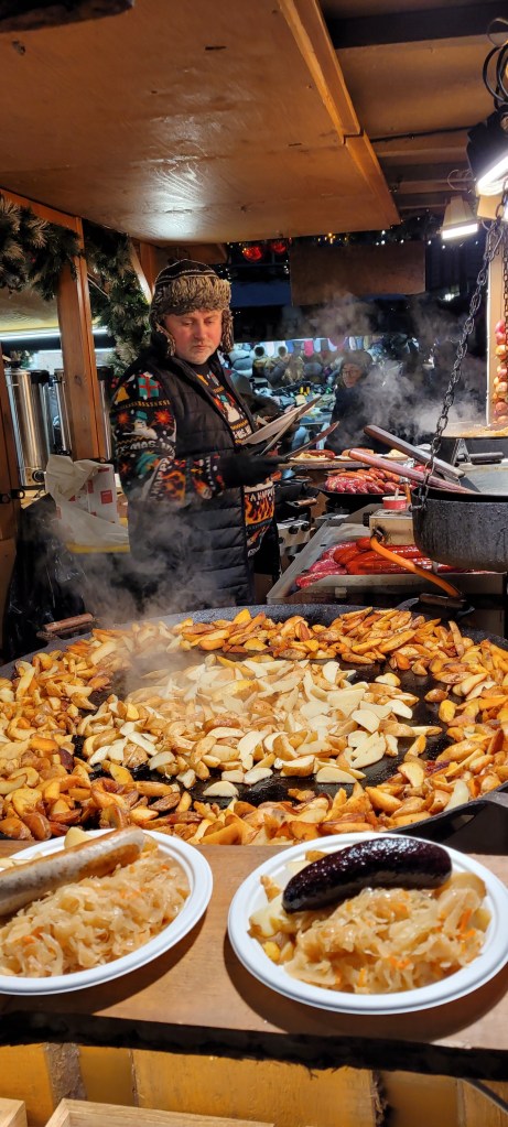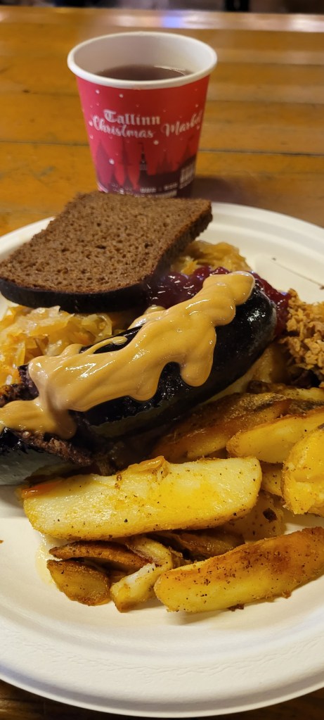 So, grabbed a traditional sausage dinner with sauerkraut, potatoes and black bread at one of the food stands. The potatoes were good but the sausage wasn’t special. Had hot wine with it. It’s called glogg.