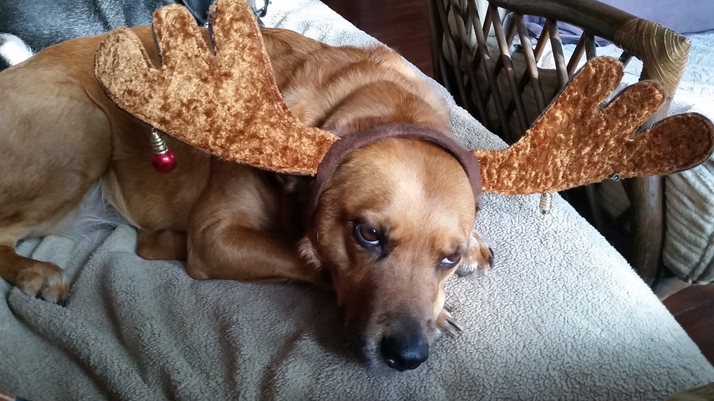 Here’s one of my dogs, Zola, showing her Christmas spirit. I took these photos a couple of years ago but I think the photos are appropriate for the Christmas season.