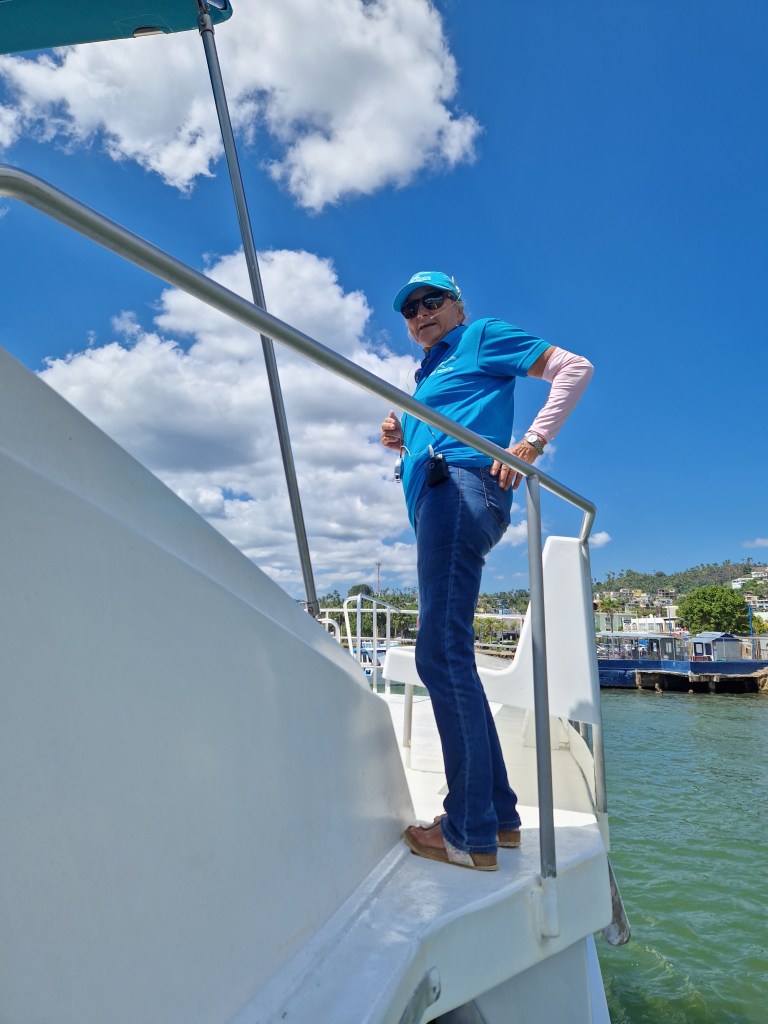 The tour was with Whale Samana and cost $59 US. You should probably make a reservation on their website. The boat, the Pura Mia, carries 60 passengers. Coke and water are available free on the boat. They’ll also give you some cookies.