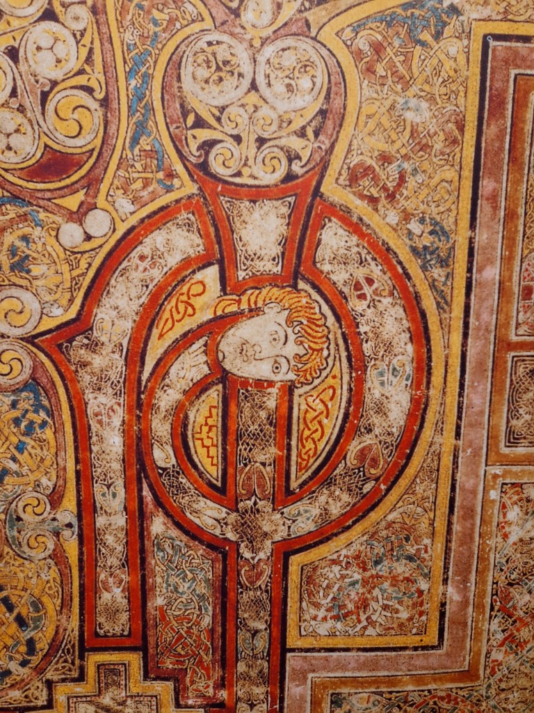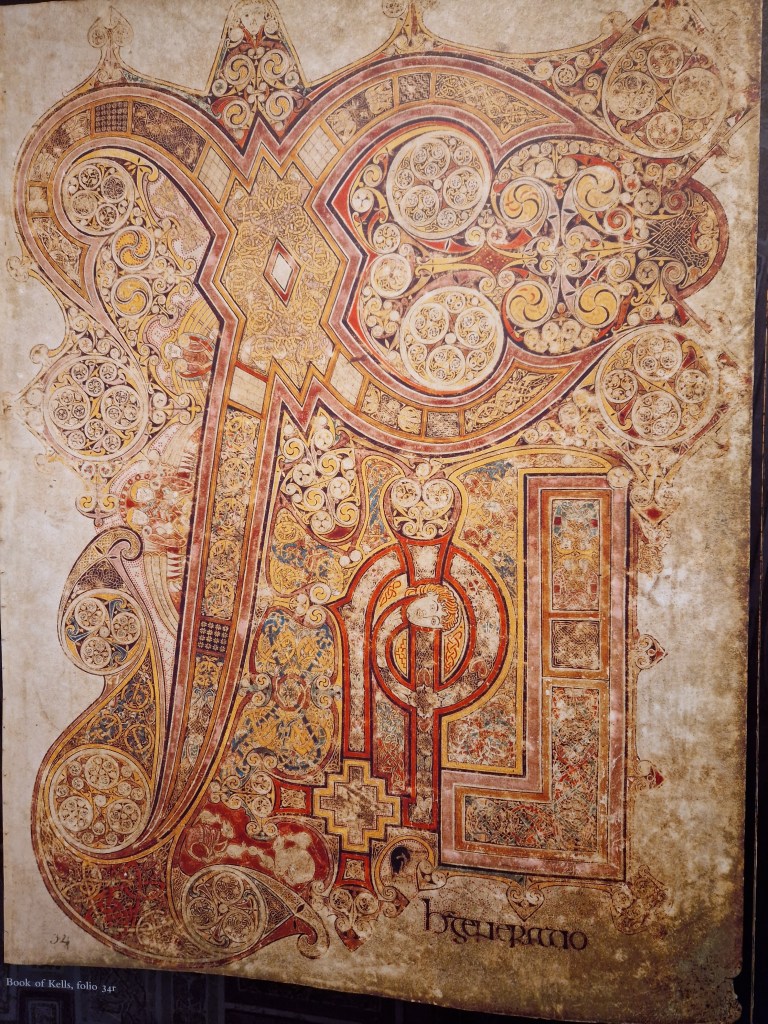 The Book of Kells is written in Latin and adorned to the hilt with intricate drawings. The book is on display in a darkened room so that light won’t degrade it. No photography is allowed. The book is an Irish treasure.