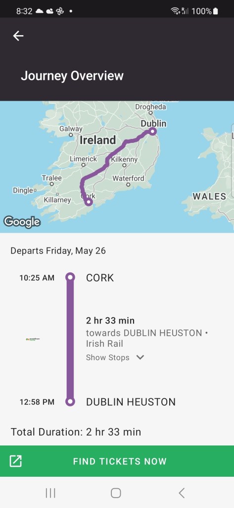 Took the train from Cork to Dublin today. It took two and a half hours and cost 34 Euros which is about $37.