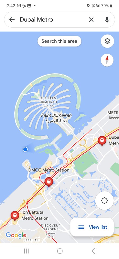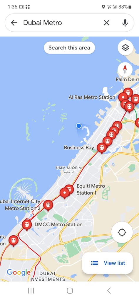 Took the Metro back toward my hotel from near the marina. Ferry cost 50 dirhams or $13.61. Metro was 8 dirhams, $2.18.