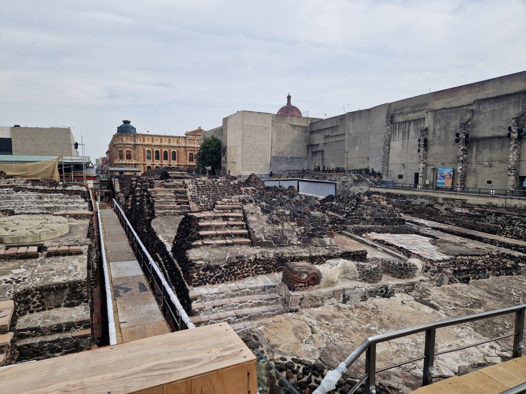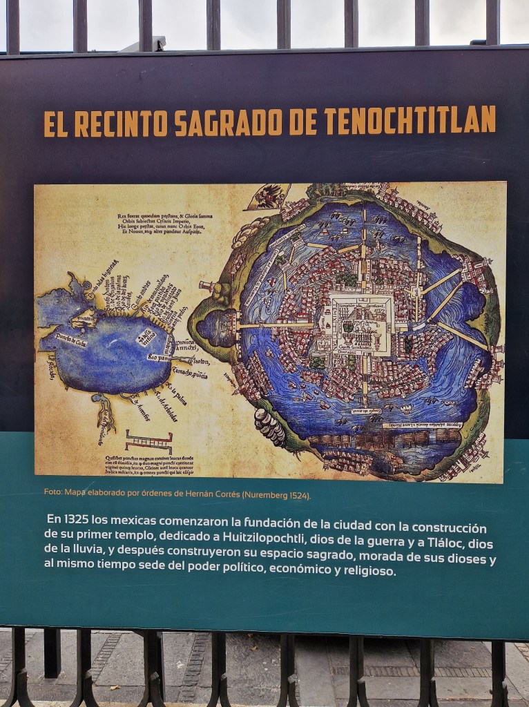 Templo Mayor is the remains of the main Aztec temple of Tenochtitlan, the Aztec city Cortez came upon in 1519 and conquered in 1521. The best weapon the Spanish had were the diseases they brought and to which the natives had no immunity.