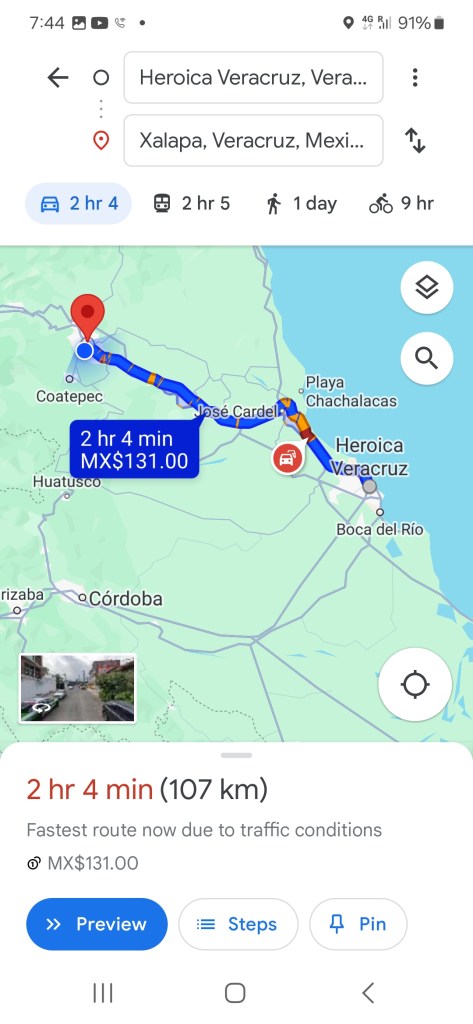 Took an ADO bus from Orizaba to Xalapa today. Six long hours without a stop. The bus had a bathroom and showed movies on six small screens distributed throughout the bus.
