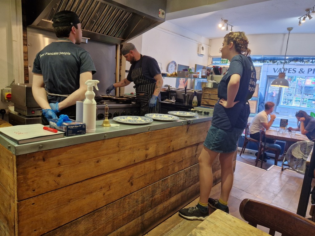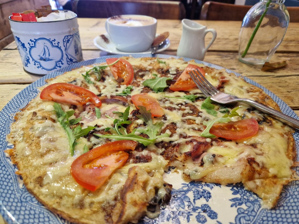 Never heard of Dutch pancakes until today in York. Looked like pizza but the underlying crust was a big crepe. Very good. They had reggae playing. Kind of a relaxing lilt to it.