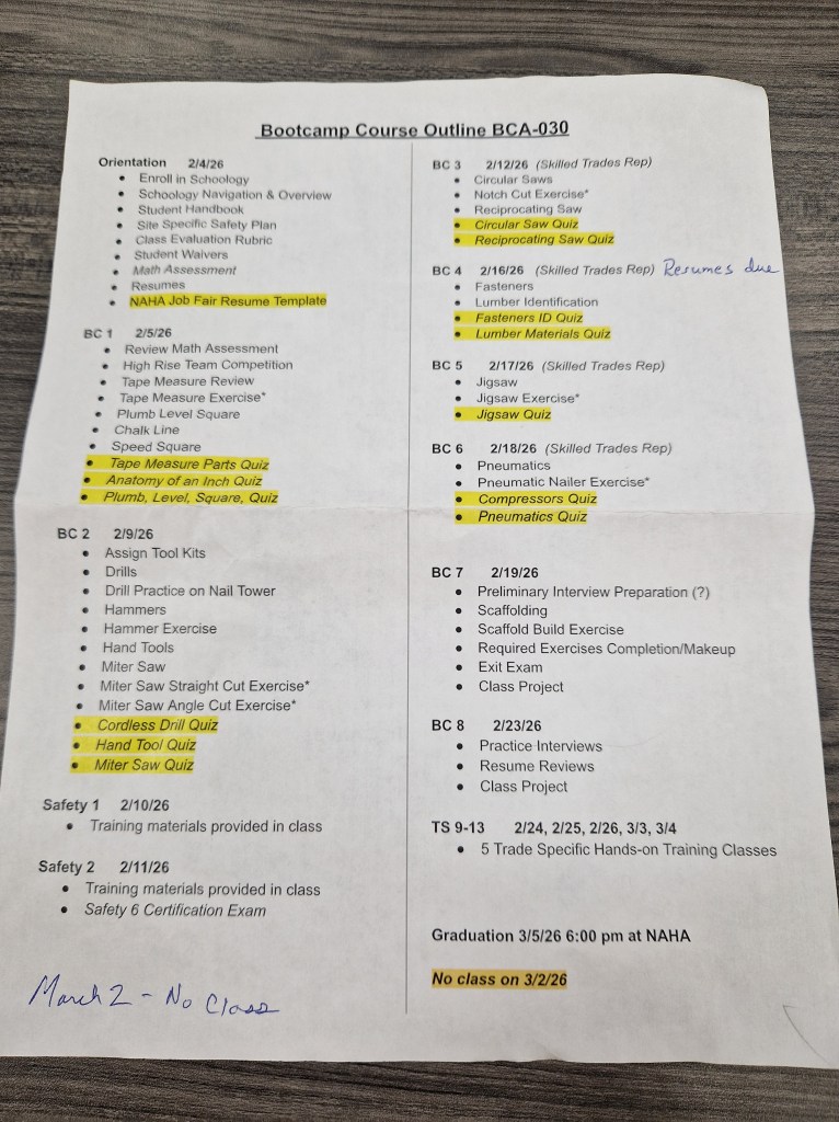 The building course is Monday-Thursday 2-5 PM for four weeks. I’ve had five classes now, including two three hour sessions on OSHA safety requirements and practices.
